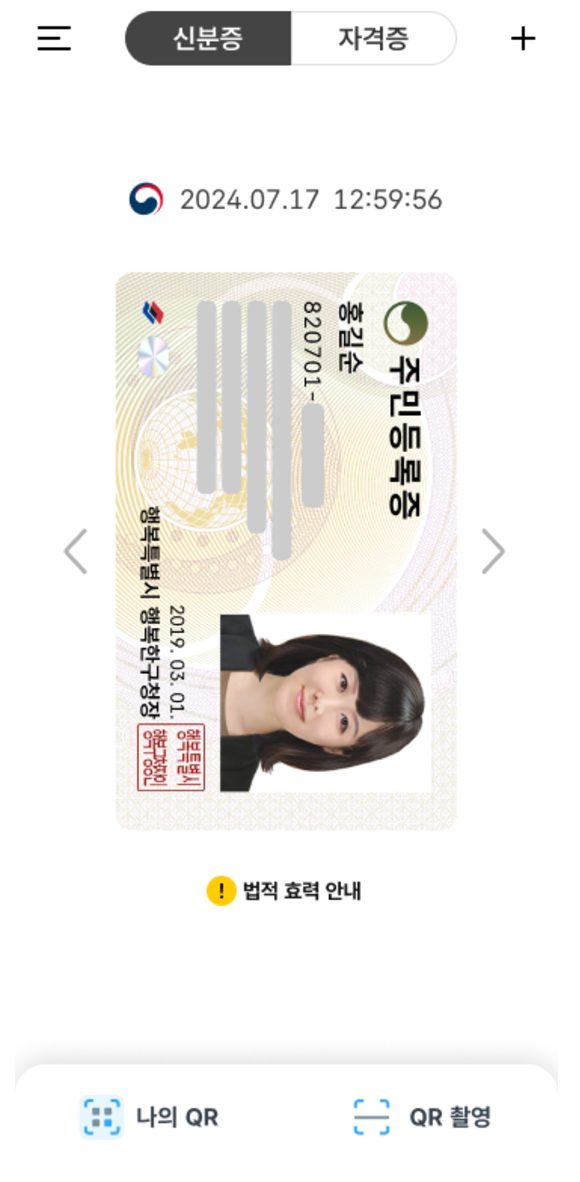 모바일 주민등록증은 스마트폰에 저장하여 사용하는 디지털 신분증입니다. 실물 카드와 완전히 동일한 법적 효력을 가지며, 다음과 같은 특징이 있습니다:
