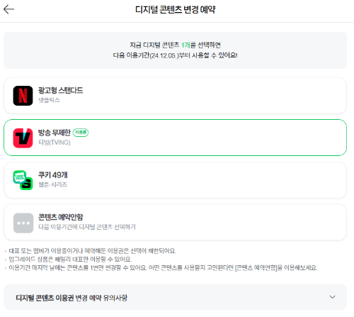 구독 혜택은 바로 적용되지 않고 갱신되는 시점에 적용할 수 있기 때문에, 빨리 확인하시고 변경 혹은 가입하는 것이 좋습니다. 이러한 혜택은 구독료 부담을 덜어주면서도 고퀄리티 콘텐츠를 즐길 수 있는 최고의 방법입니다.