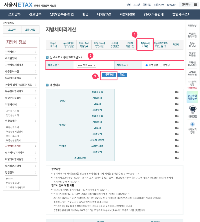 - 자동차세 연납 신청 메뉴 선택: 신청(1)→ 연세액납부(2) → 자동차세 연세액납부 신청(3)