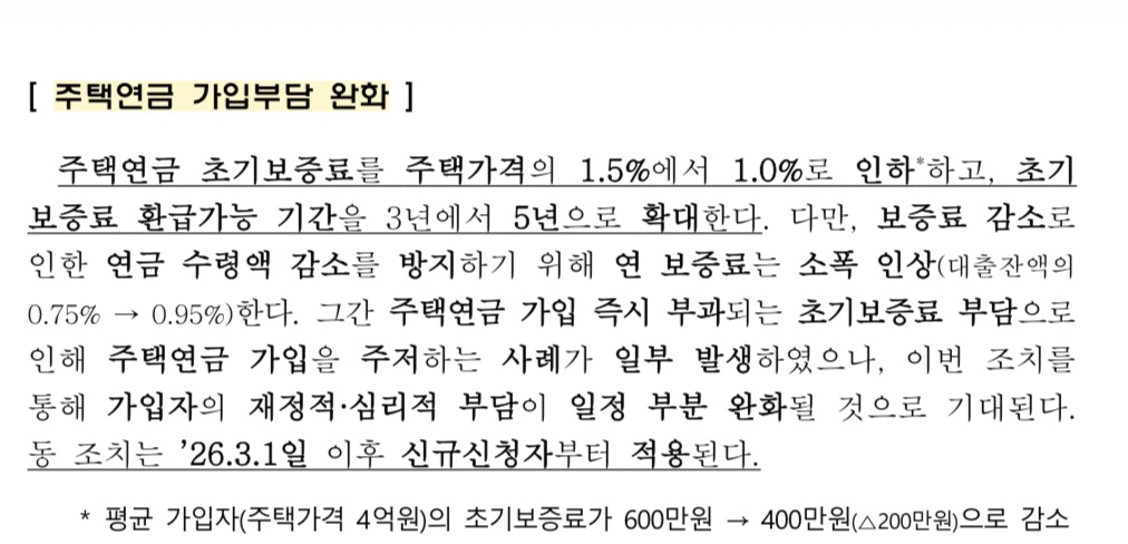4억 주택 기준으로 가입비가 200만 원이나 줄어듭니다. 여전히 비용은 발생하지만, 진입 장벽이 대폭 낮아져 더 이상 치명적인 주택연금 단점이라고 보기는 어렵게 되었습니다.