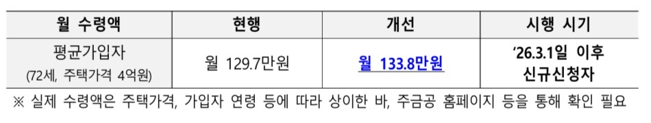 72세(4억 주택) 기준으로 보면, 평생 총 수령액이 약 849만 원 늘어나는 효과가 있습니다. 물론 물가 상승을 완벽히 따라잡지는 못하겠지만, 인상된 금액으로 어느 정도 방어가 가능해졌습니다.