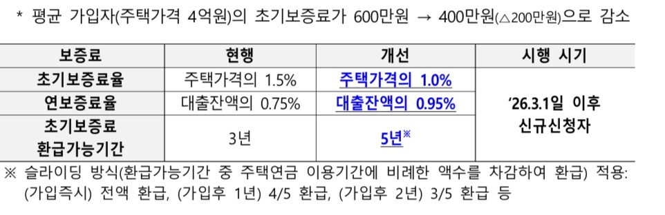 가입 시 주택가격의 1.5%를 납부하던 초기보증료가 2026년 3월 1일부터 1.0%로 인하됩니다.