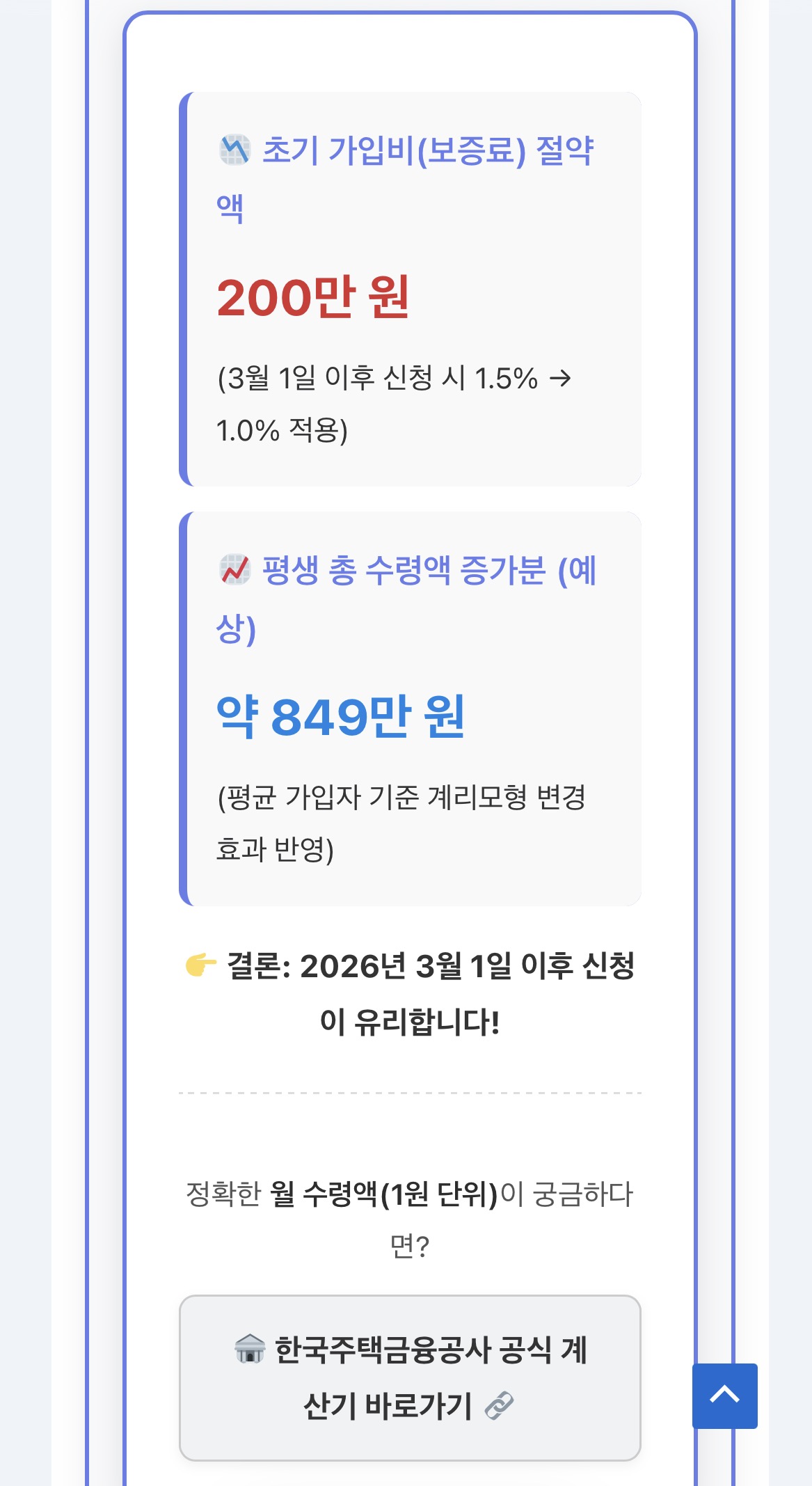 위에서 말씀드린 수령액 인상분(3.13%)과 초기보증료 인하(1.0%)를 모두 반영하여, 내 집값만 넣으면 바로 결과를 알 수 있는 계산기를 활용해 보세요.