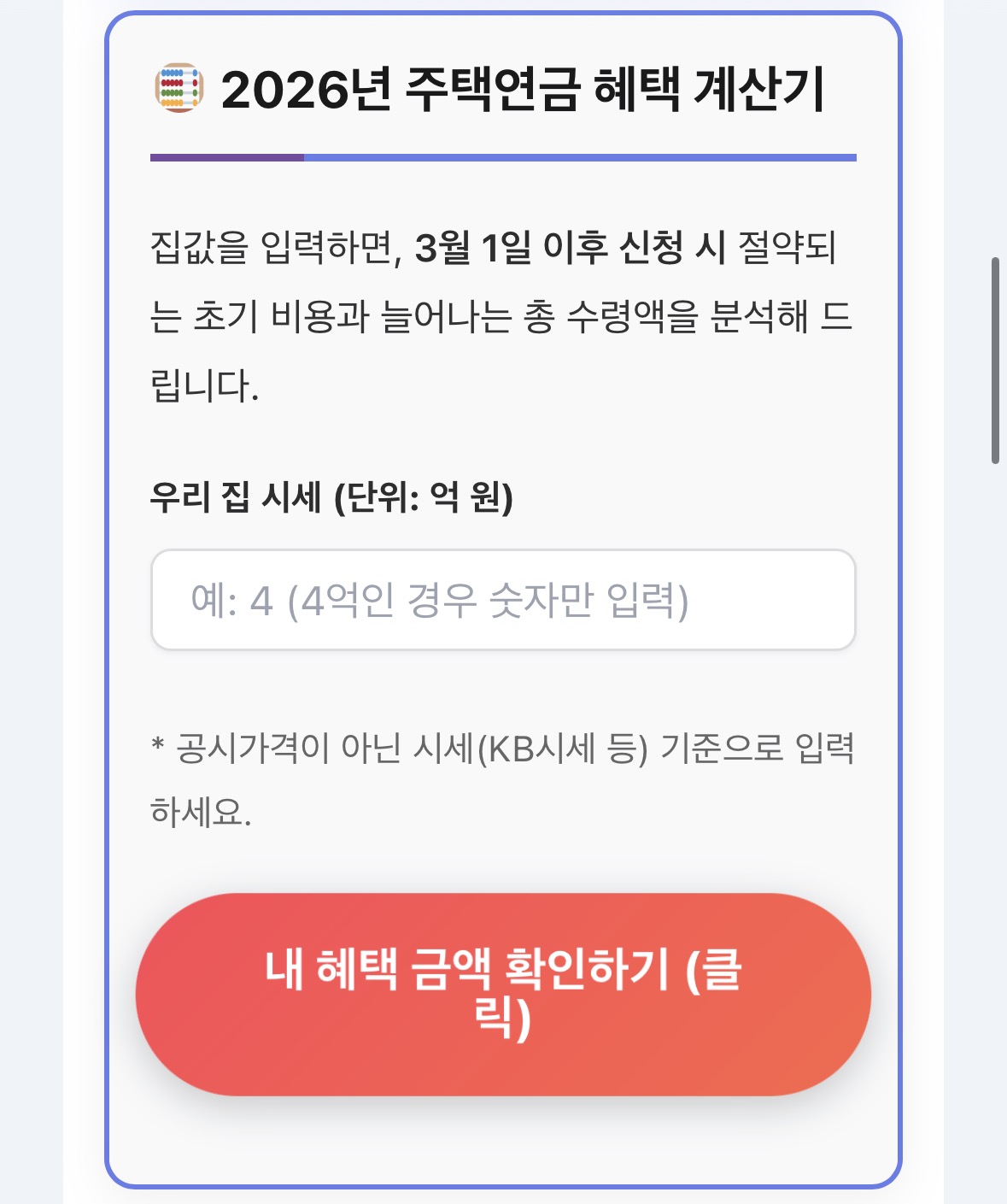 복잡한 공인인증서 로그인 없이, 주택연금 수령액 계산 결과를 1초 만에 확인하고, 내가 3월 이후에 가입하면 얼마를 더 이득 보는지 분석해 줍니다.