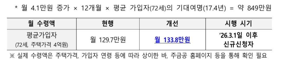 위 표를 보시면, 72세에 4억 원 주택을 보유한 경우 기존에는 129만 7천 원을 받았지만, 개편 후에는 133만 8천 원을 받게 됩니다. 매달 약 4만 원, 평생으로 따지면 849만 원을 더 받게 되는 셈입니다.