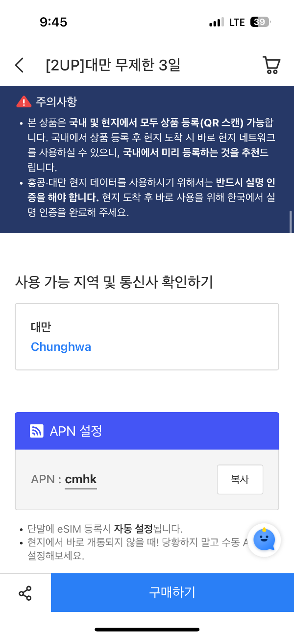 - 미국(로컬) 상품은 발권 시 상품 사용 시작일과 사용할 단말 정보를 필수로 입력해야 하는 상품입니다. 입력한 정보는 발권 후 수정 불가하니 유의해주세요!