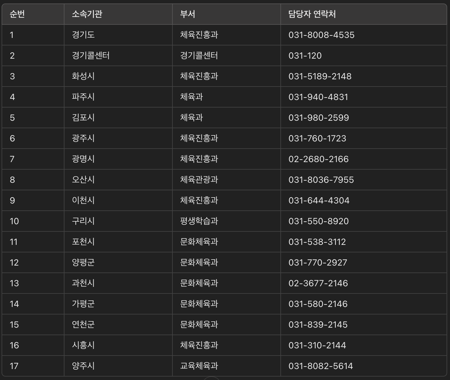 궁금한 점이 있다면 각 시군 담당부서로 문의해 주세요. 체육인 여러분의 건승을 기원합니다!