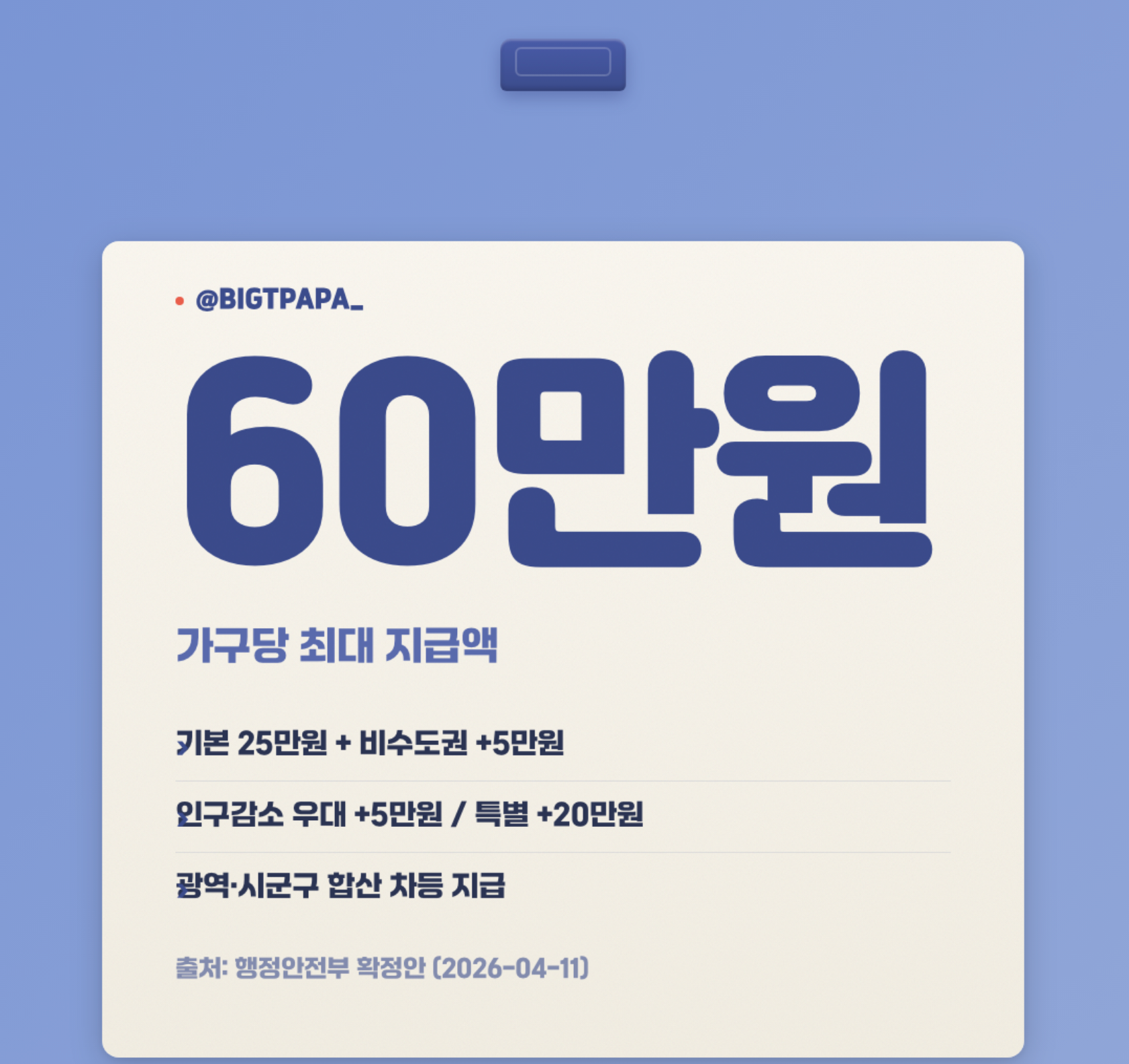 행정안전부가 4월 11일 확정 고시한 고유가 피해지원금 자격조건 건보료 기준 지급액은 가구당 최대 60만원입니다. 단순한 정액 지급이 아니라 4단 누적 구조라는 점이 핵심입니다.