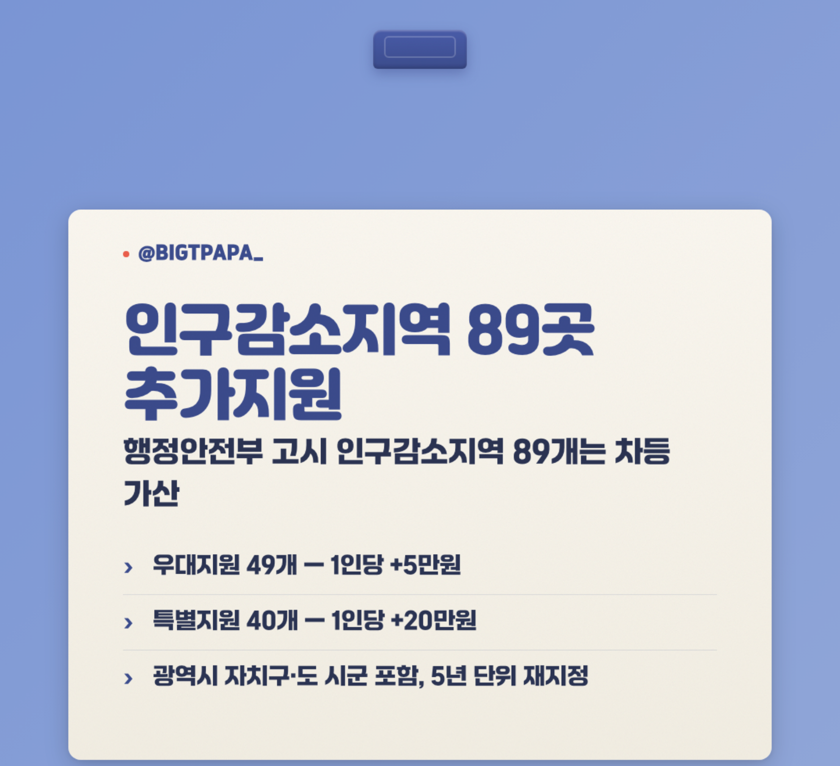 우대지원 49곳은 1인당 5만원이 가산되고, 특별지원 40곳은 1인당 20만원까지 가산됩니다. 인구감소지역 가산은 주민등록상 주소지를 기준으로 행정안전부 시스템이 자동 판정하므로 신청자가 별도 신고할 필요는 없습니다.