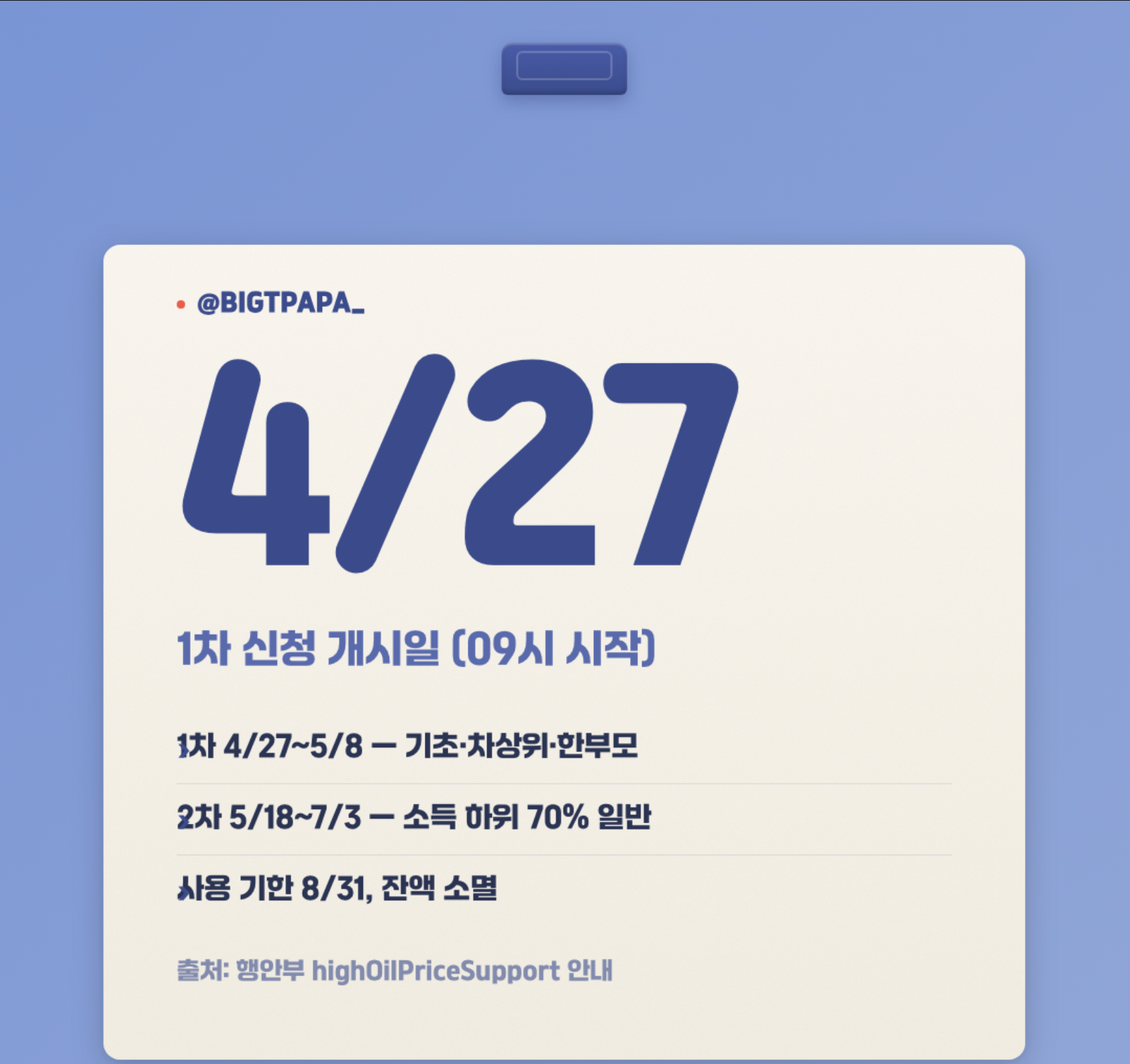 리터당 휘발유 2,000원이 일상이 된 4월, 정부의 26조 추경이 4월 10일 본회의를 통과했고 행정안전부는 1차 신청을 4월 27일 09시부터 개시한다고 확정 고시했습니다. 가장 먼저 묻게 되는 질문은 두 가지로 좁혀집니다. 고유가 피해지원금 자격조건 건보료 커트라인이 얼마이고, 우리 집은 가구당 얼마를 받는가.