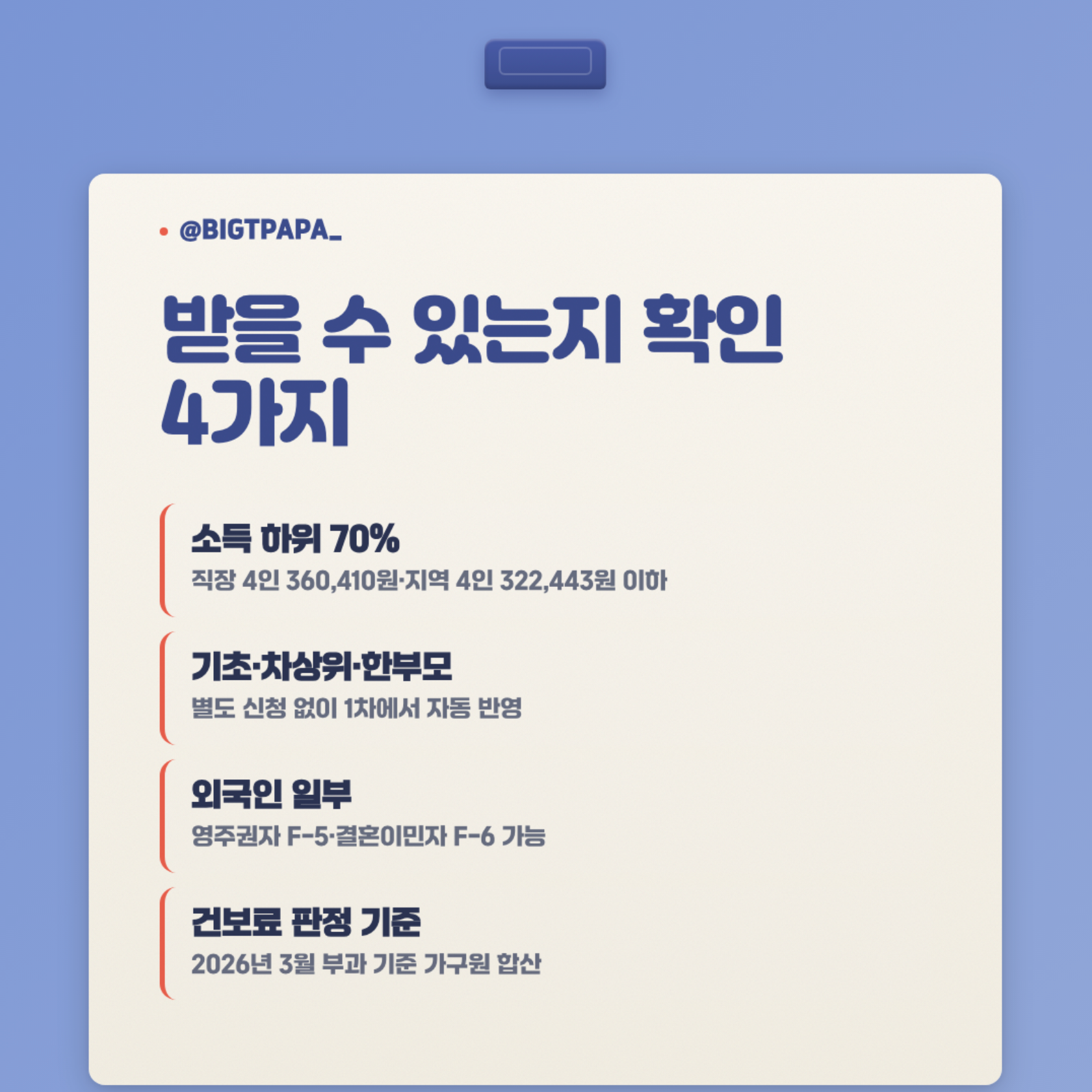 외국인 가구는 영주권자(F-5)와 결혼이민자(F-6)가 동일 기준으로 포함되며, 그 외 체류자격은 이번 차수에서 제외됩니다. 기초생활수급자·차상위계층·한부모가족 등록 가구는 건보료 커트라인과 무관하게 1차에서 자동 반영되므로 별도 계산을 할 필요가 없습니다.