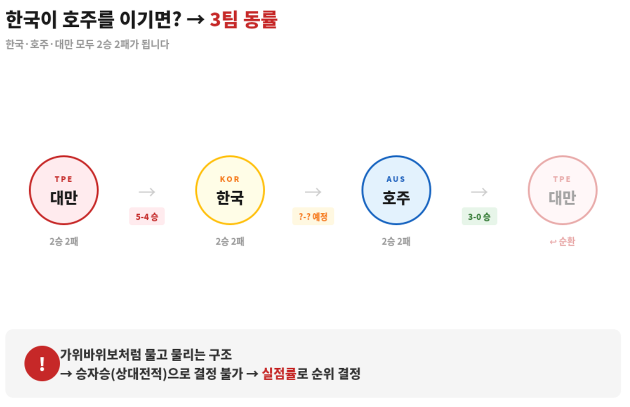 남은 건 2위 자리 하나. 호주(2승 1패), 대만(2승 2패), 한국(1승 2패) 세 팀이 경쟁하는 구도입니다.