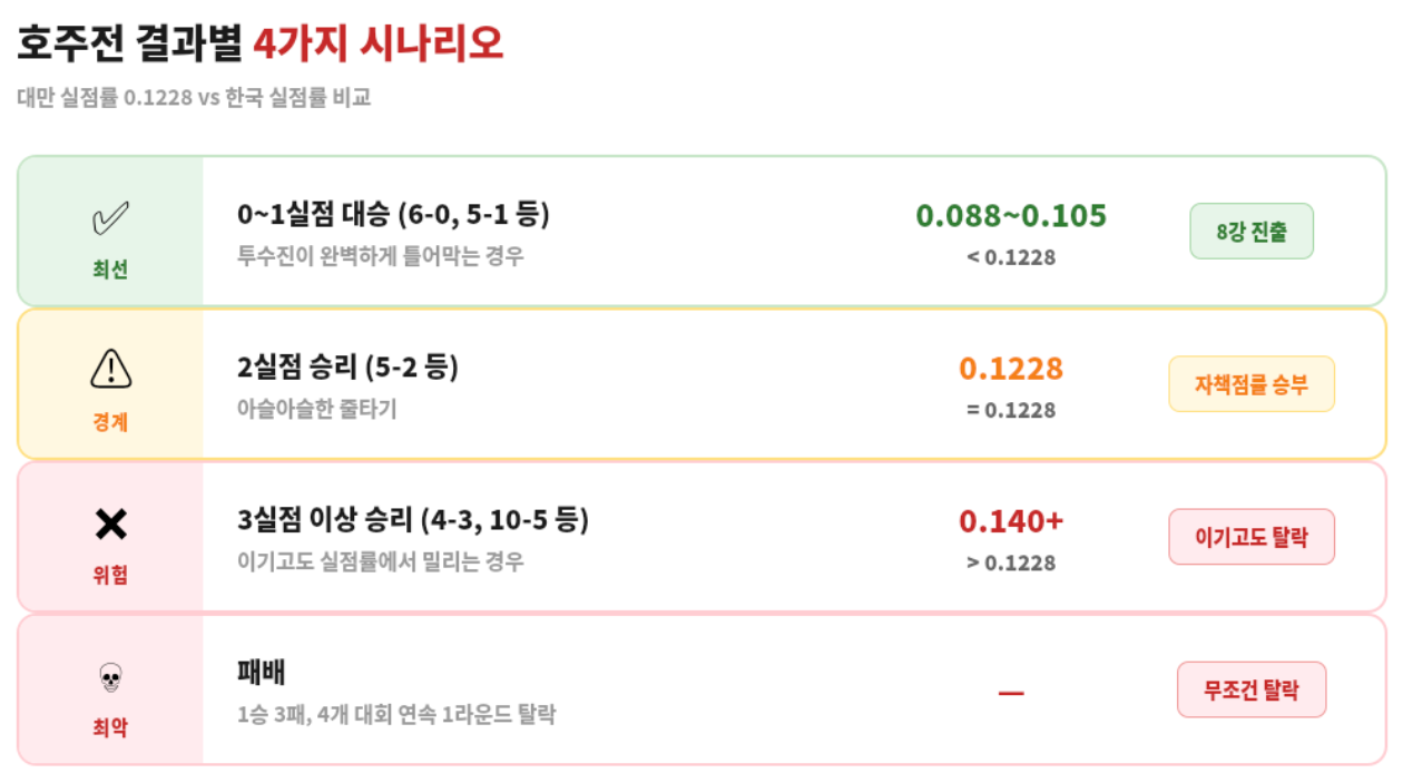 한국 실점률이 0.088~0.105 정도가 되는데, 대만의 0.1228보다 확실히 낮아요. 걱정 없이 8강입니다.