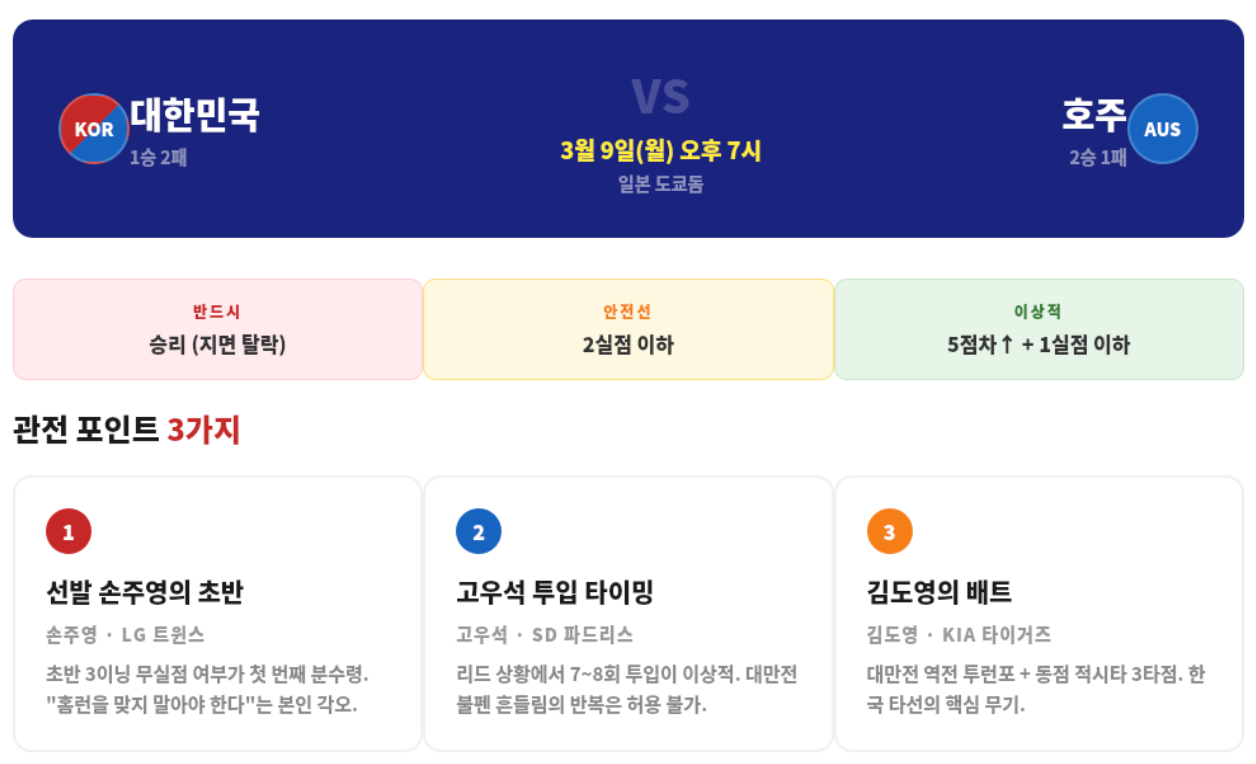 한국 야구의 17년 만의 8강 진출이 걸린 마지막 경기. 타선의 폭발도 중요하지만, 투수진이 2실점 이내로 막아내는 것이 진짜 승부처입니다.