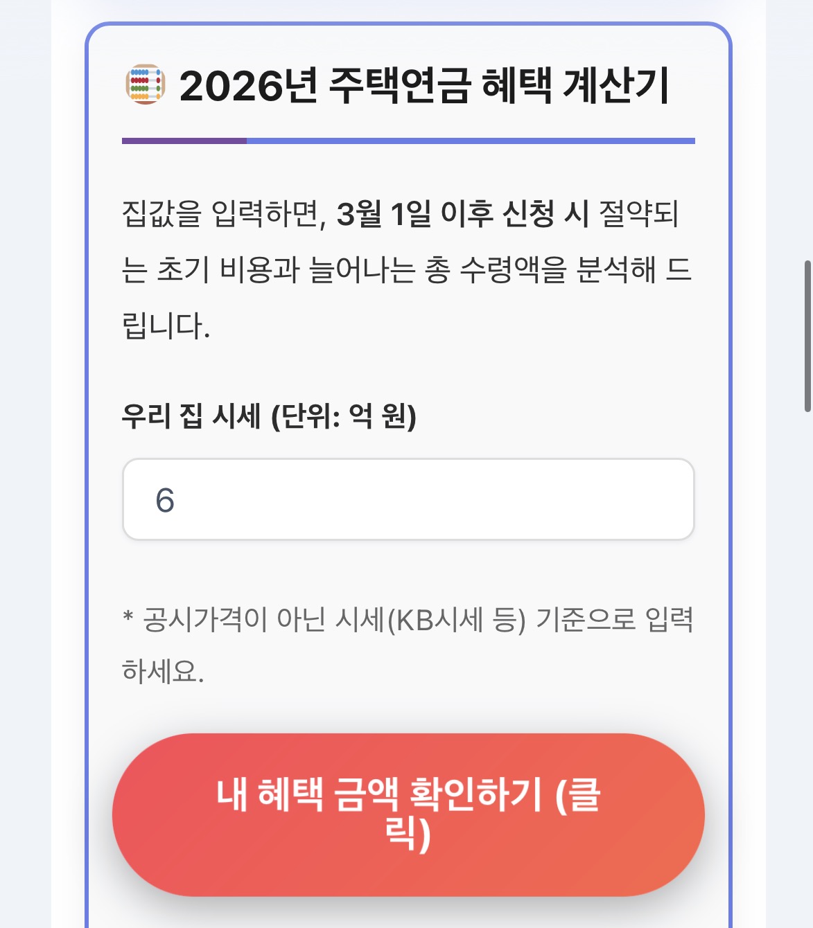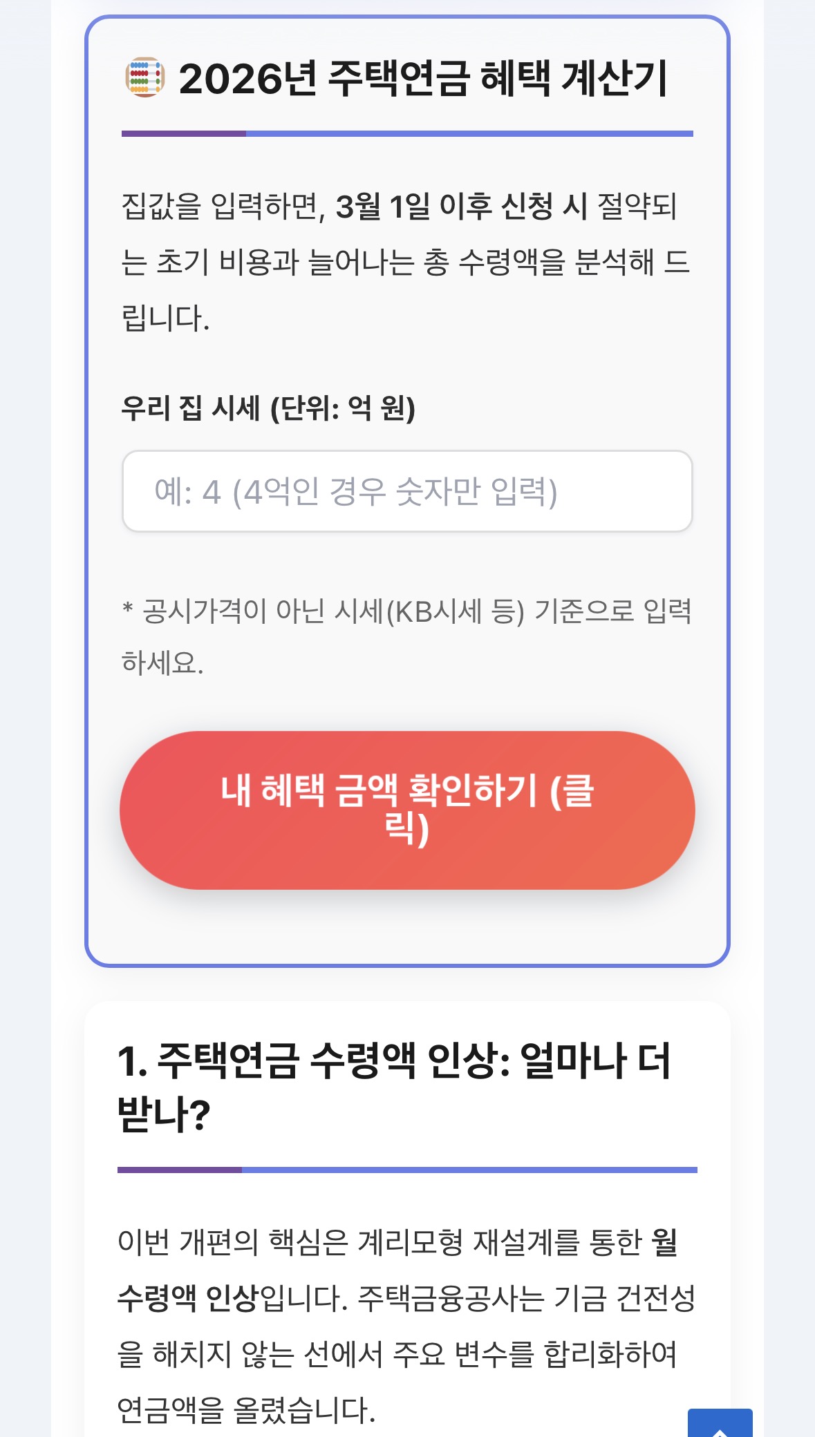 복잡한 서류 준비 전에, 내 집값과 나이만 입력하면 가입 가능 여부와 변경된 수령액을 1초 만에 알려주는 계산기를 확인해 보세요. 로그인 없이 바로 조회가 가능합니다.